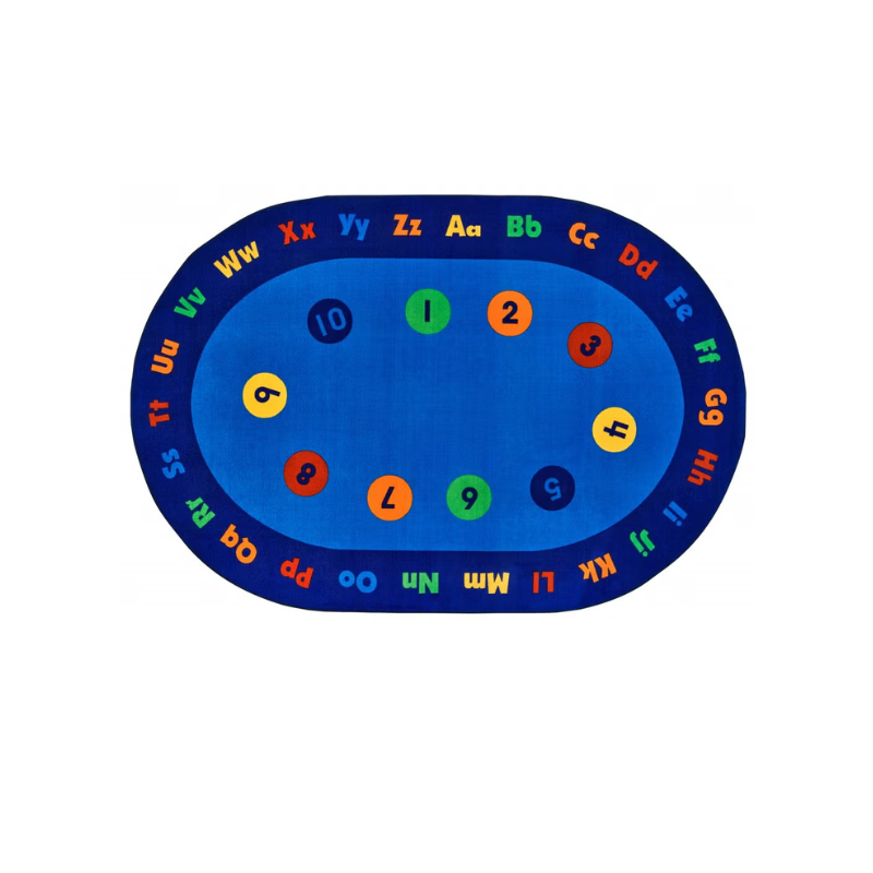 Circletime is an important time in the classroom. This great value carpet features uppercase and lowercase letters and numbers 1-10 in classic blue with rainbow colors on the border.